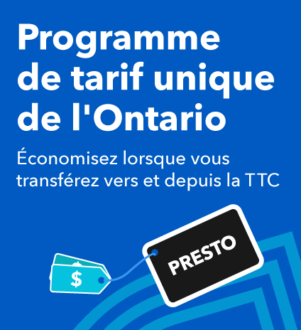 Programme de tarif unique de l'Ontario offre aux usagers du transport en commun des transferts gratuits lorsqu’ils voyagent entre la TTC et GO Transit, Brampton Transit, Durham Region Transit, MiWay et York Region Transit. Tapez simplement une carte PRESTO, une carte de crédit ou de débit, ou PRESTO dans Mobile Wallet à chaque point de transfert, et un rabais sera automatiquement appliqué à votre mode de paiement.